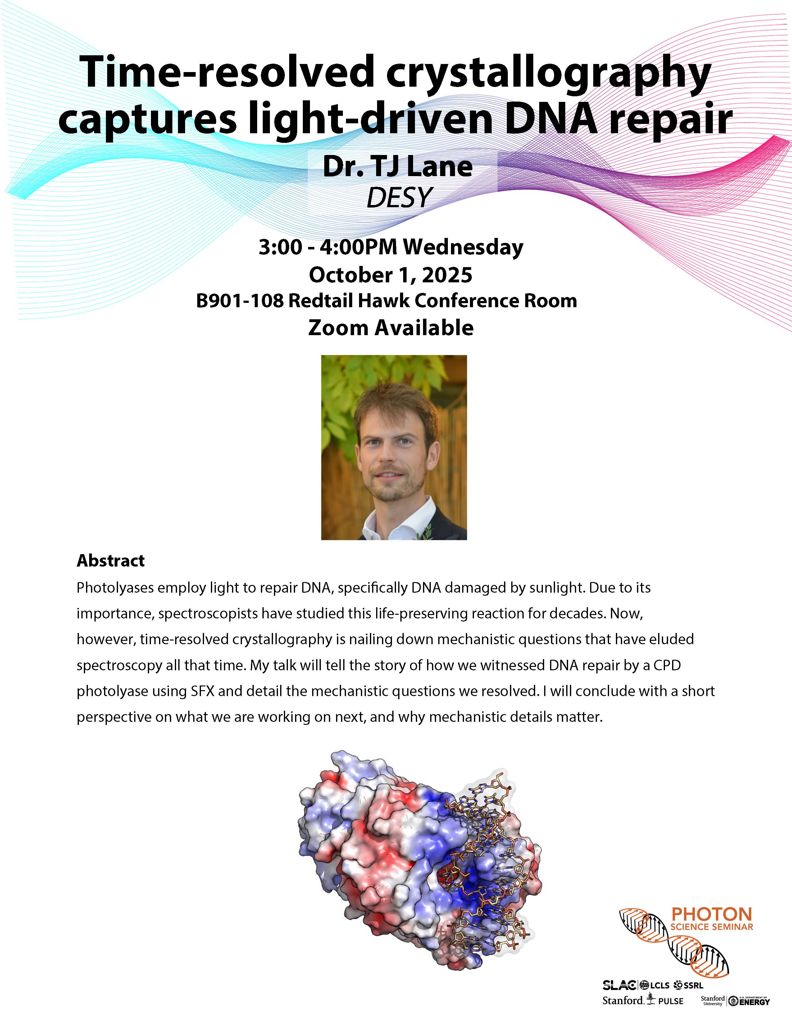 Photolyases employ light to repair DNA, specifically DNA damaged by sunlight. Due to its importance, spectroscopists have studied this life-preserving reaction for decades. Now, however, time-resolved crystallography is nailing down mechanistic questions that have eluded spectroscopy all that time. My talk will tell the story of how we witnessed DNA repair by a CPD photolyase using SFX and detail the mechanistic questions we resolved. I will conclude with a short perspective on what we are working on next, and why mechanistic details matter.